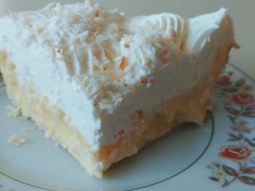 Coconut in a homemade vanilla pudding with fresh whipped cream or meringue and toasted coconut on top.