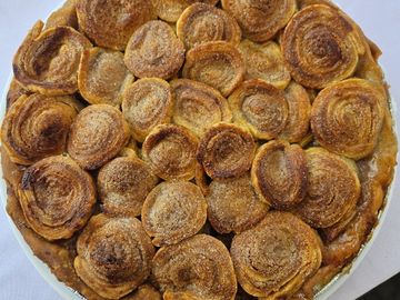Apple pie with small cinnamon rolls made from pie crust, cinnamon, sugar and butter.