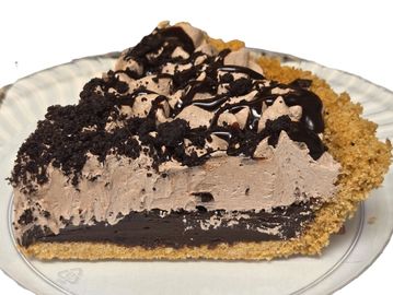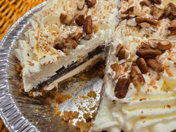 Pecan crust with layers of cheesecake, homemade chocolate pudding, fresh whipped cream, toasted pecans and chocolate shavings.
